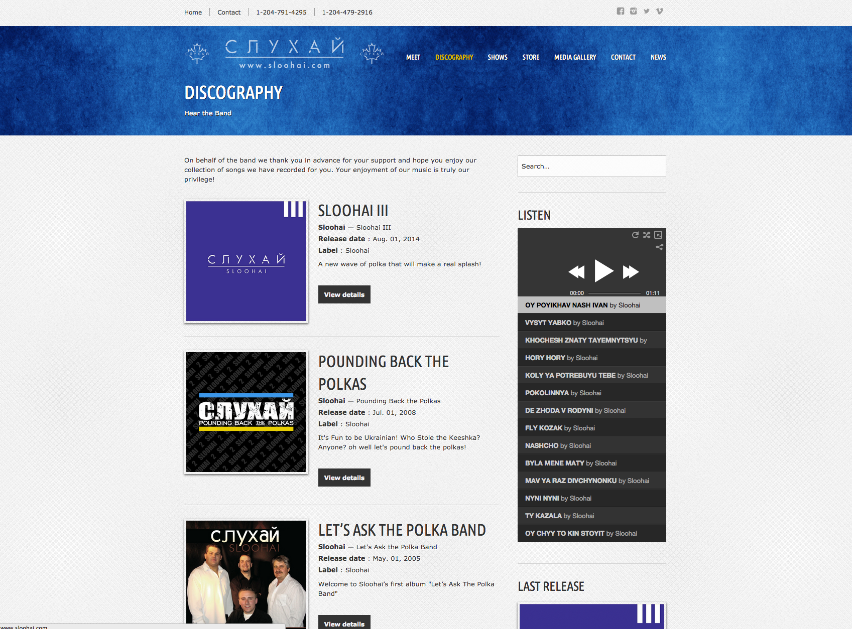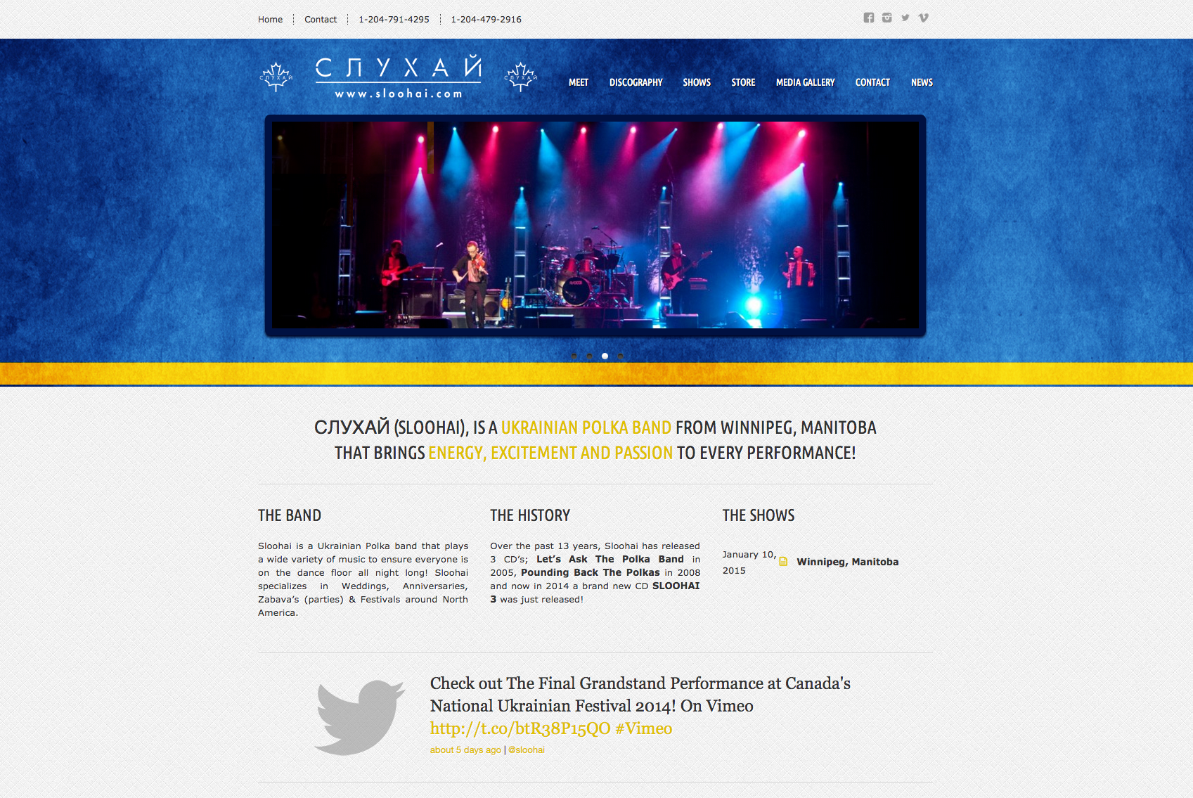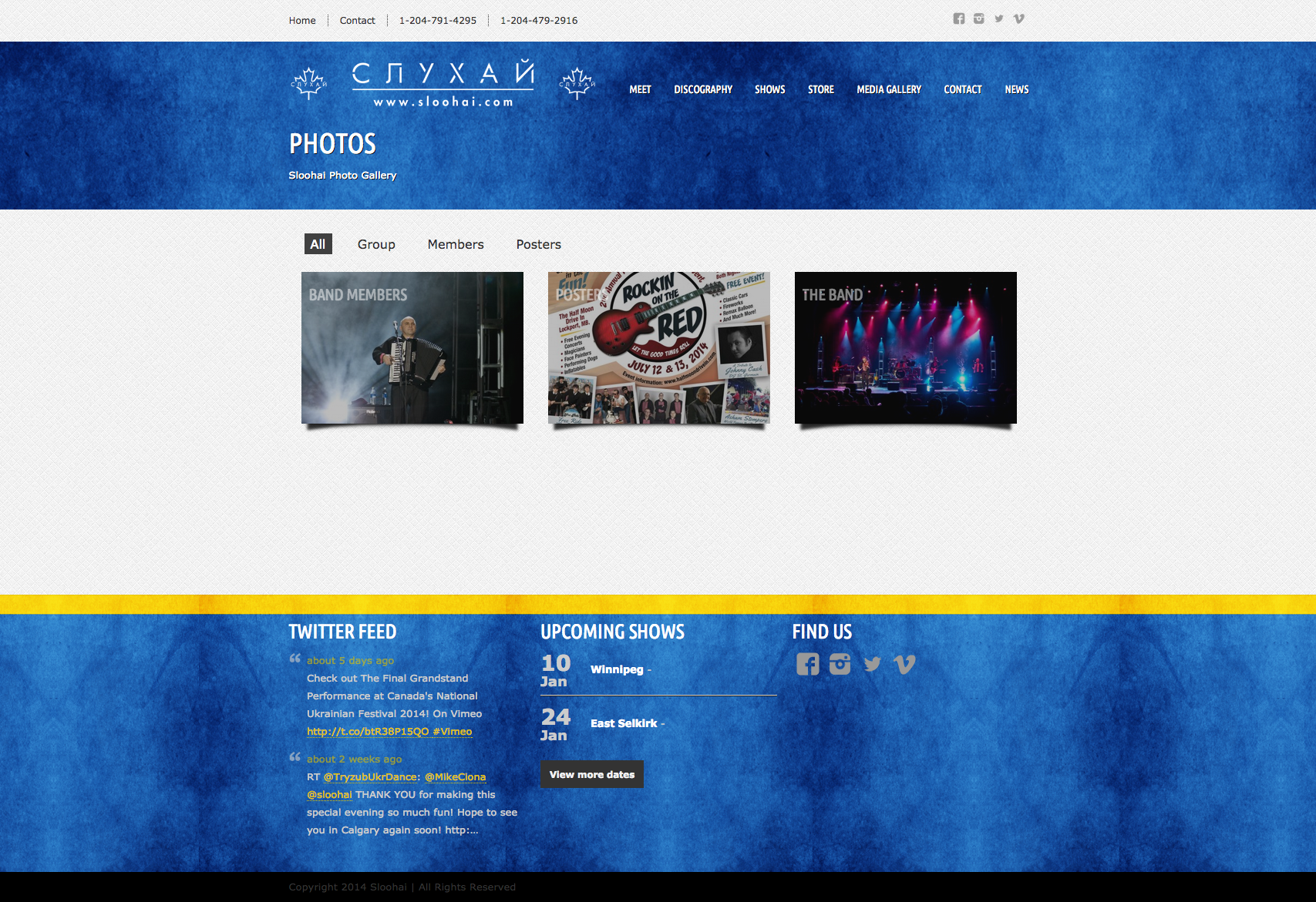 After some discussion it was decided to purchase a pre-made template that already incorporated all the elements they needed to save a lot of time and a lot of cost. Once the template was chosen it was then customized and tweaked to suit Sloohai using their logo, Ukrainian flag colours, sizes and section placements and then all content was created and aded to the site. There are video galleries, photo galleries, an online store, show calendar and samples of every song from each album embedded into an audio player on the sites Discography section.